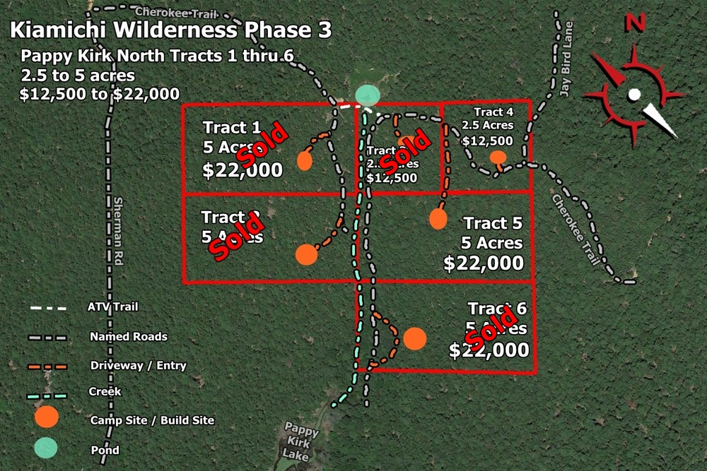 We have 1 tract that is 2.5 acres each with excellent access located in Phase 3 of The Kiamichi Wilderness just past the North side of Pappy Kirk Lake and close but not on Sherman Road. Each is heavily timbered and has a new driveway and camp/cabin site. This property comes with so many perks.
