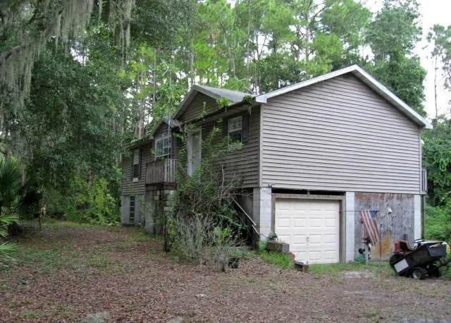 Nice acreage with potential. Old Florida with large oaks, fauna & small pond. Modular home with full storage, workshop & garage underneath with 3 garage doors for drive-thru ease. AC unit has been removed, duct work remains.