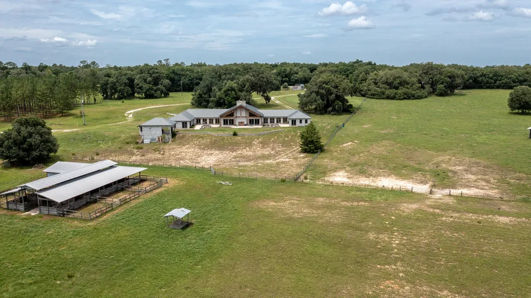 This spectacular 144-acre hilltop farm offers fantastic views high above Levy's Prairie and a resort-style feel. From the gated entrance follow the trail with wonderful views in every direction to the main entrance of this one-of-a-kind custom-built 7,200-square-foot home. Upon entering the home you are immediately struck by the amazing details of the grand entry with its huge cut glass doors, marble floors, and intricate wood details, from there you enter the huge family area with towering wood beam carved ceiling, walk-in fireplace, and views of the prairie below. The kitchen has a large island with lots of room that flows into the family area. The primary bedroom offers a large walk-in closet, sitting area, walk-in shower, and garden tub. There is an oversized four-car garage, a detached sauna/workout building, stables, and a barn. This is an incredible opportunity at a great price! {...