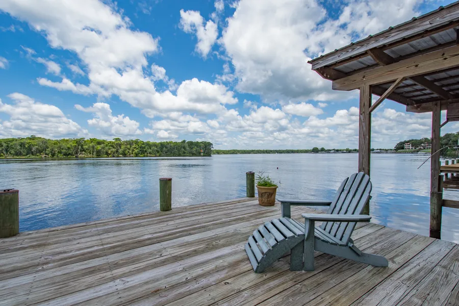 MID-CENTURY Modern construction w/100+/- ELEVATED FT. ON THE ST. JOHNS RIVER. This 3BR/2-1/2 BA home w/hardwood floors, cypress ceilings and stone fireplace is beautifully updated & has scenic views of the river from most rooms in the home. The high ceilings & multiple windows allow loads of natural light to flow throughout this beauty which is the perfect home for entertaining. Check out the brick paver patios which offer panoramic views of the river and make the perfect spot to see the fabulous sunsets. Stow your boat in the boathouse with boat lift or just enjoy the breeze from the dock. Home includes a detached 2 car over-sized garage with attached 1BR/1BA apartment (480 sq. ft h/c). All of this situated on 2.2 +/- acres of beautifully landscaped land. A must see!!