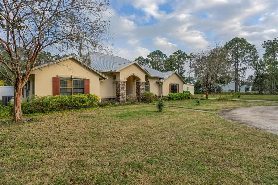 MULTIPLE OFFER SITUATION-H&B requested by Noon, Dec. 18th please. 3.16 Acre Country Estate featuring 3 bedroom 2.5 bath PLUS home theatre/media/game room, private salt water pool, metal roof, gutters, paved driveway, attached 2 car carport, detached 2 car garage, pole barn with electric & two storage sheds, fenced, private entry Gate. Carport has pull-down attic stairs with ample storage above. Granite counter tops, open floorplan, stainless steel appliances, new range & microwave, walk-in pantry, breakfast bar, washer & dryer also convey, gas fireplace in the family room, Generac generator system, built-in surround sound, french doors, covered lanai, tall ceilings, hardwood flooring, walk-in closets, jetted soaking tub, laundry room..... easy access to St Augustine, Gainesville, Ocala & the St Johns River. Palatka Horseman Club is just down the street.