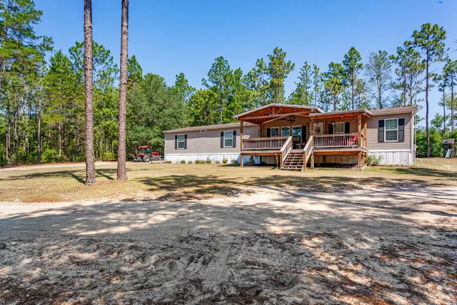 BRING ALL OFFERS! This spacious and meticulously cared for 4-bedroom, 3-bath mobile home features a thoughtfully designed split bedroom plan. Ideal for families, the home includes a Jack and Jill bath between two bedrooms, ensuring both convenience and privacy. The living room boasts a cozy wood-burning fireplace perfect for family gatherings. The hidden walk-in pantry offers ample storage, and the entire home has all brand-new flooring installed in 2023. For peace of mind, the property is equipped with a hard-wired video surveillance system with ADT. Outside, the property features a 12' x 16' shed with electric and water, as well as a 12' x 30' shed with electric. The fridge in the smaller shed and the deep freezer in the larger shed are included. A brand new 24' pool provides endless summer fun, while the outdoor firepit with wooden swings creates a perfect spot for relaxation. There is also a jungle gym for children. The property spans just over 13 acres, including 1 fenced acre dedicated to the house and 1 fenced acre for livestock, featuring a two-stall goat pen. Goats are negotiable. There is also a 200 amp service by the pond, suitable for an RV or to build a small cottage. Outdoor furniture includes two picnic tables.