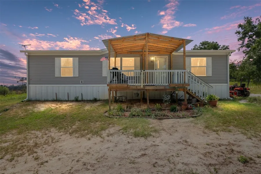 Beautiful, LIKE NEW (2024) energy-efficient 3/2 mobile home on 4.08 acres! Just under 1300 square feet. No carpet - LVP flooring throughout. Smart thermostat. Upgraded, ENERGY-EFFICIENT appliances. Oven has regular, convection, and air fry capability. Side by side refrigerator has inside water dispenser and large freezer drawer on the bottom with icemaker. Washer/Dryer included. Relax on the large covered 10x14 front porch - sip your coffee and watch the wildlife - deer, turkey, etc! Includes 4 solar-powered owner-mounted outside cameras. Small fenced area in back for pets. Zoned agriculture - plenty of room for animals and garden - perfect for a homestead! Includes 14x14 shed. Home has solar panel capability. Water filtration system at well. Seller was in process of installing irrigation system, will leave just under 300' of Sharkbite Plex B and all fixings to complete the project. Transferrable warranty. Enjoy the tranquility of living in the country but still having the convenience of Gainesville (approx 20 miles) and Ocala (approx 30 miles) close by! Qualifies for USDA financing! Boundary lines in aerial photo are approximate.