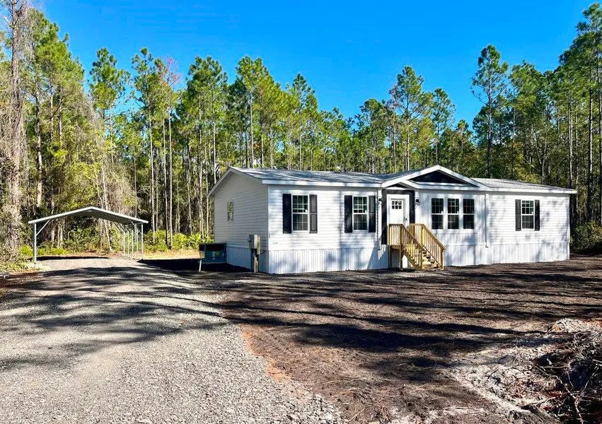 This brand new 3-bedroom, 2-bath manufactured home is situated on two lots totatling over 1.5 acres, conveniently located just minutes from shopping and the St. Johns River. The thoughtfully designed spacious and open layout prioritizes comfort and functionality. The interior features drywall finished walls with crown molding throughout, and all bedrooms have walk-in closets. The kitchen boasts a large kitchen island, ample cabinets, a farmhouse sink, microwave, oven, and dishwasher. The spacious yard is perfect for outdoor activities, and a covered detached carport and milling driveway are also included. This home is ideal for first-time buyers or anyone seeking a fresh start. With its great location and value, don't miss out - schedule your showing today!