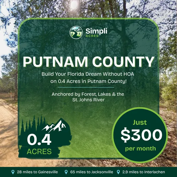 Power's already at the road (huge money saver), you're on solid high ground, and you get the perfect blend of country peace with city convenience. Just 18 miles to Palatka for shopping and dining, 28 miles to Gainesville and UF, yet far enough away to see actual stars at night. Build your homestead, park your RV for weekend escapes, or hold it while Florida land values keep climbing!