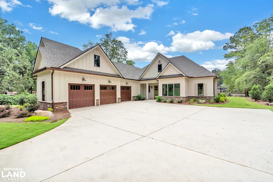 Welcome to your dream lakeside retreat on Lake Oconee in Georgia! Crafted by renowned lake area builder, Smith Built Homes of Lake Oconee, this custom masterpiece awaits its lucky owner. This modern oasis boasts 4 bedrooms, 4.5 bathrooms, and a plethora of luxurious features. Step inside to discover an open-concept floor plan designed for seamless entertainment. The main level features three bedrooms including the primary suite, two guest bedrooms with ensuite baths, a convenient half bath. Ascend to the expansive bonus room over the garage, offering endless possibilities such as a fourth bedroom, office, or flex space. A three-car garage offers plenty of room for your vehicles and storage. Inside, admire the exquisite trim package featuring stained beams throughout, adding character and charm to every corner. While a total of three fireplaces with gas logs, including a stunning double-s...