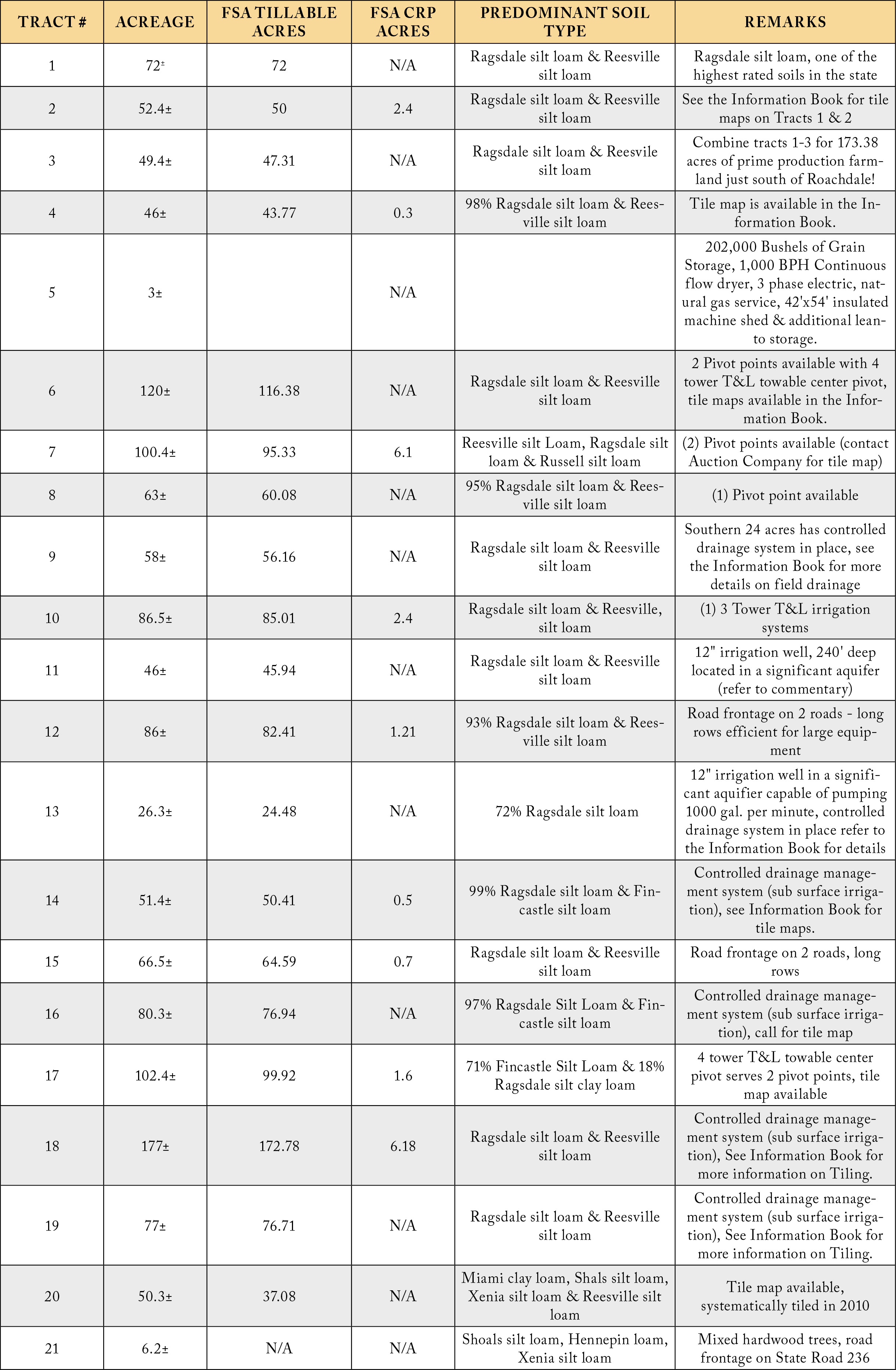 Tract 13: 26.3 ac 72% Ragsdale silt loam. 24.48+/- acres FSA tillable. 12' irrigation well in a significant aquifier capable of pumping 1000 gal. per minute, controlled drainage system in place refer to the Information Book for details.