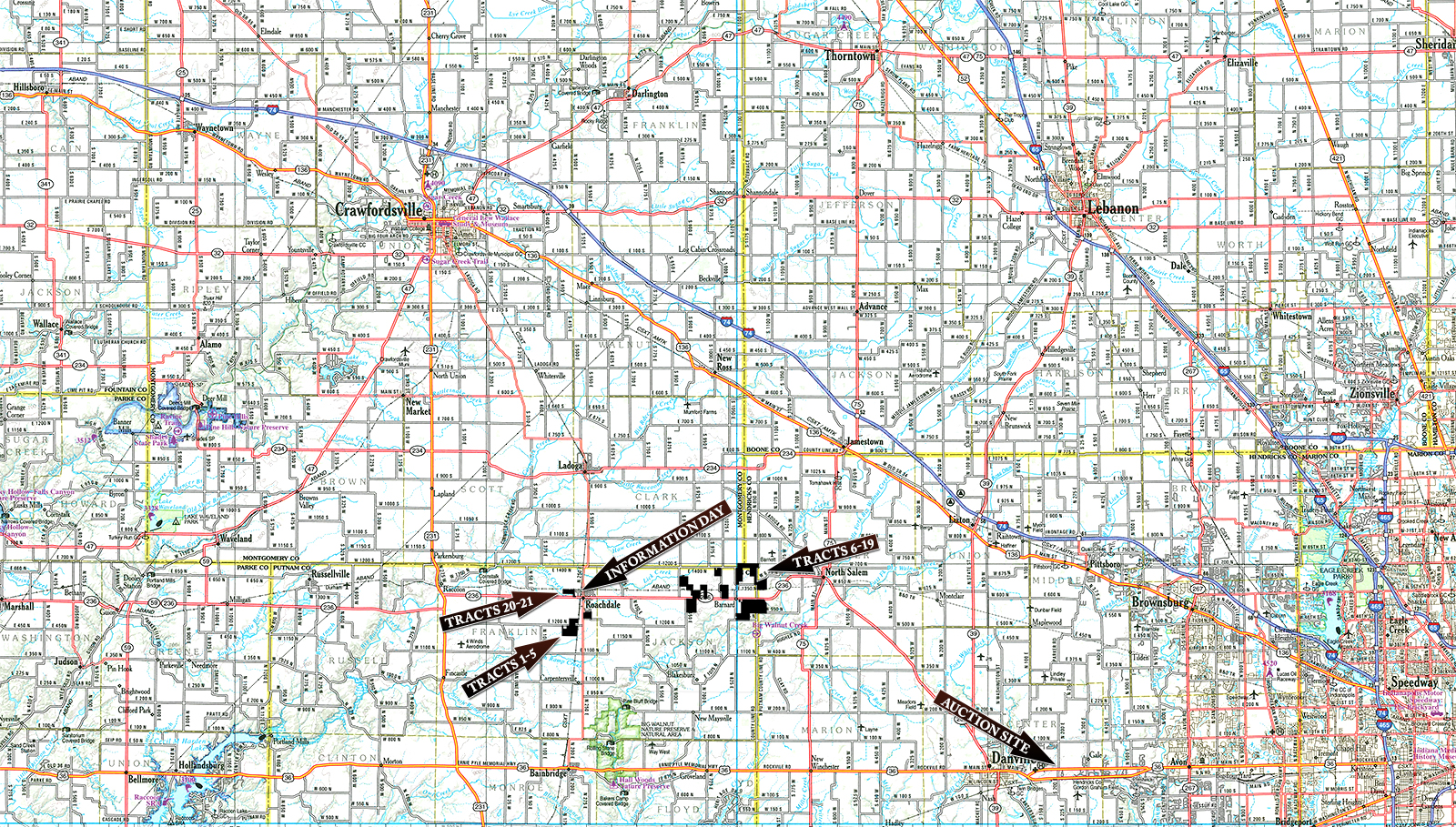Tracts 6-19: Travel East of State Rd 236 for 4.1 miles & Tracts 6 & 8 will begin on the North & South side of the road. As you continue East on State Rd 236 look for signs to additional Tracts North & South of 236.