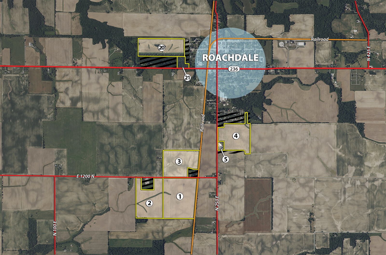 Tracts 1-5: Travel South on Indiana St (County Rd 250) for .2 miles & Tract 4 will begin on the left (East). To Tracts 1-3 continue South on County Rd 250 South to County Rd 1200 N. Turn right (West) on County Rd 1200 N Tracts 1-3 will begin in .2 miles.