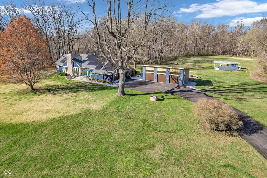 Be amazed when you step into timeless elegance with this beautifully renovated and meticulously restored mid-century modern estate on a private 9-acre retreat-like setting. This 5-bedroom, 4.5-bath home blends classic architectural lines with thoughtful contemporary upgrades, offering a rare opportunity to own a piece of design history reimagined for modern living. Inside, you'll find expansive living spaces with clean lines, hidden historical surprises, and views of nature out every window. Original architectural details have been lovingly preserved, while high-end finishes, and state-of-the-art appliances bring comfort and sophistication. The primary suite is a sanctuary of light and calm, featuring an en-suite bath and walk-in closet with original details, and direct access to the grounds through a private sunroom. 4 additional bedrooms, including a guest suite with private bath, offer flexible space for family, friends, or a rental suite with private entrance. Outside, the property unfolds into a natural paradise-rolling lawns, mature trees, wildlife to enjoy and curated landscaping. There is ample storage in the various closets, walk-in attic, 2-car attached garage, or new 3-car heated detached garage. Whether you're entertaining by the swim spa under the covered patio, or having a cocktail on the front porch, this home offers a rare blend of architectural integrity and tranquil seclusion. You'll love the hardwood floors, custom wall treatments, vintage color scheme, and large custom kitchen. The library features floor-to-ceiling bookcases and custom vintage built-ins to be admired. The finished basement includes a wet bar, game room, family room with fireplace and half bath. The home is efficient with solar panels and Tesla batteries, and has had nearly every space updated and restored with too many improvements to mention. Located just minutes from town and an easy commute to Indy or Terre Haute, yet a world away, this is more than a home-it's a lifestyle!