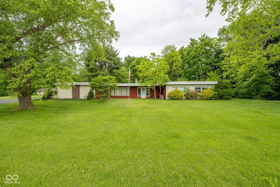 Mid-Century modern home on 3.3+ wooded acres with water views offers the perfect blend of privacy, style, and convenience. With serene water views from the front and tranquil forest scenery out back, you'll feel miles away from everything-yet you're right across the road from city limits. Step inside this timeless 3-bedroom, 1.5-bath home and discover the charm of a spacious formal living room anchored by a striking wood-burning limestone fireplace-ideal for cozy evenings. The large, updated eat-in kitchen boasts modern conveniences with plenty of room to gather and entertain. A dedicated laundry room and an attached 2-car garage with an extra storage room offer everyday practicality. Enjoy morning coffee on the welcoming front porch overlooking the water views of Albin Pond or unwind on the private back patio surrounded by trees. The partially-fenced backyard features two fenced areas-perfect for pets, gardening, or play. Need even more space? A mini-barn provides extra storage, and meandering paths with a quaint walking bridge invite you to explore your own wooded sanctuary. Whether you're relaxing in nature or heading into town, this home offers the best of both worlds. All appliances and mini-barn included.