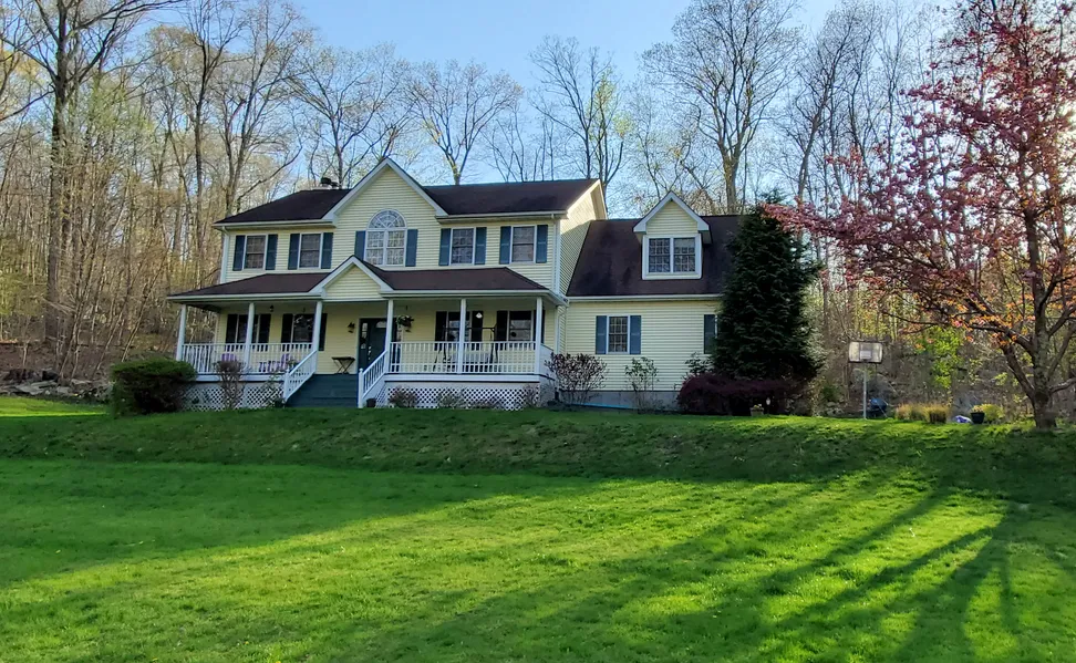 Mahopac school district, Carmel P.O. Sunny, private farmhouse colonial with sprawling, open lawn, set on almost 4 private acres. Serenity and privacy, yet close to shops and town. Sit back and relax on your rocking chair front porch or sunny patio in the backyard. The main floor offers both a living room and a family room with fireplace, formal dining room and eat in kitchen. Laundry and half bath round out the main floor, plus two car garage that can easily accommodate a lift. Upstairs the primary bedroom features a 4 piece ensuite bath and two walk in closets, a gigantic walk in attic that can be easily converted to a bonus room or office, three other oversize bedrooms and a hall bath complete the second floor. Property includes a lovely level lawn and woods with trails and streams. Add to all this, walking distance to the bike trail. Route 6, shopping and dining are just around the corner. Nothing to be done but move in and enjoy!