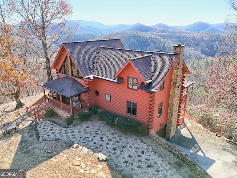 656 Brown Bear Ridge Trail is a custom Lincoln Logs home perched at the top of the ridgeline with panoramic long-range, layered mountain and valley views that will lift your spirits, and captivate your soul. Sitting on over 3 acres at the end of the road this private lot will provide year-round, timeless sunrises and sunsets that will take your breath away, and an endless supply of colorful skies, interesting geographic features and approximately 270 degree views. The uniqueness of this property is perhaps best exemplified by the Cherokee Trail Marker tree that sits just off the front porch. When people say 'million dollar views', this is what they're talking about. Once inside, you'll love the warmth, natural light and meticulous attention to finish details, and the mechanical components of the home. Four bedrooms including the primary on the main level with it's own deck and spa. Three guest bedrooms upstairs along with an office. The loft could be used for a multitude of purposes, and takes advantage of the views and openness to the two story great room with large masonry fireplace. The home has numerous upgrades and has been extremely well taken care of with maintenance records available upon request. A deep well with a strong flow rate, water purification system, whole home generator, spa, 1,000 gallon propane tank, gas logs, and much more. There is a two-car, drive under garage, but additionally there is a three-car detached garage just across the graveled courtyard. Bring your binoculars because you'll want to get a closer look at the views of the Persimmon Valley and North Georgia mountains available from this vantage point. And when the stars come out at night, you'll feel like you have a private planetarium. All this located near the Coleman Recreational area to include the Coleman and Tallulah Rivers, Lake Burton, lots of USFS land, and all that North Georgia has to offer in the way of outdoor activities. The private road is 2WD accessible. High end furnishings throughout from regional shops such as Timpson Creek, Mountaintop, and local artisans all of which are negotiable. Home has a lighting protection system, invisible pet fence & 3M tinting on windows. Septic permit is 3BDR.