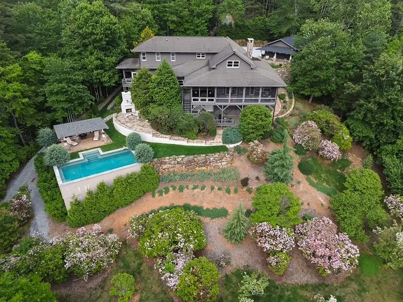 “WinsHill” is a private four acre estate perched on a high knoll in Rabun County with stunning layered views of the surrounding thousands of unblemished acres of US Forest Service land between Clayton, GA and Highlands, NC. Originally built as a fish camp accessing nearby world class fly fishing streams, the current owners have converted the property into a casually elegant paradise for those seeking rural quiet tranquility offering complete privacy, high-speed Starlink internet for anyone wishing to work remotely and shopping, dining and entertainment amenities 15 minutes away. Recent enhancements include the addition of a heated gunite saltwater pool, rock walls and terraced perennial gardens, carriage house with covered stone floor porches, upgraded infrastructure and a 26Kw Generac whole house generator for seamless uninterrupted services. An exclusive hidden gem of a property.