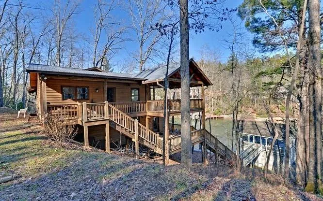 Easy access to eating and gas. This 4BR/3.5BA cabin features wood burning FP, 2 story, 2-stall boat house, master on main, wood floors and great lake views. Neat & ready to move into. Priced for Quick Sale. None better at this price!!