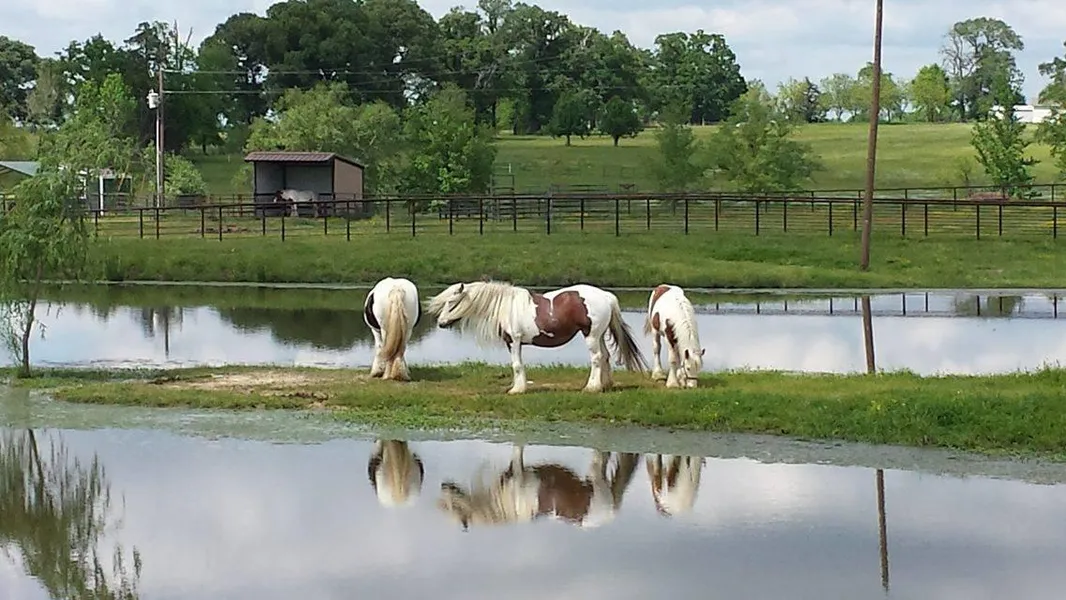 50+ Acre Horse Ranch in East Texas currently being used as a horse breeding farm. Beautiful rolling green hills on sandy loam soil. 2.5 miles pipe cross-fencing - fenced for cattle or horses. 4500 SF drive-through barn with hay storage, 22 amp panel, water available to barn, 5 stalls, covered wash rack, loaf shed, equipped for breeding, equipment storage and hay storage, cattle working area, alley, catch pens, palpation and loading chutes. Roping Arena and 1200 SF workshop. Run-in shelters in each pasture. 2 single, 1 double and 1 triple run-in stays on property. 2 24x50 corrals, 1 40x40 corral. 1 acre and 1/2 acre paddocks by barn along with several smaller pens. Year-round creek bisects land and is spring fed with culvert to drive over. Property is not located in a flood zone. Sprigged Coastal Bermuda and Tifton fields, well-maintained native grasses, 2 stocked ponds stocke...