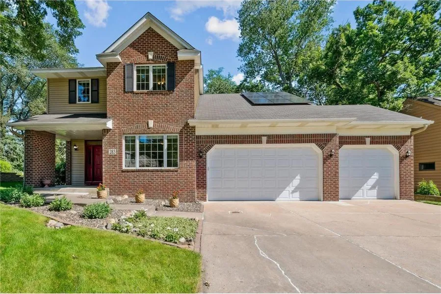 Welcome to this beautifully maintained 4-bedroom, 3-bath, 2-story home in the desirable North Oaks Addition and Mounds View school district. The main level features an updated kitchen with new countertops, new hardwood floors, and brand-new appliances-all flowing into a vaulted great room with gas fireplace, open dining area, and access to a private backyard oasis with mature trees, beautiful closet and a fully updated bath with new tile flooring, tile shower, and glass door. You'll also find a main-level office, family room, laundry, and new carpet throughout the main floor and stairway. Solar panels on the roof help reduce utility bills year-round. 3 stall garage with oversized garage doors, and an in-ground sprinkler system. Over 1600 sq feet in the lower level to finish as you desire to bring your total square footage to nearly 4,000 sq ft.