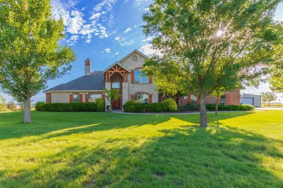 Wow...5 acres with unique panoramic views of rolling canyon and the Amarillo skyline. Private and peaceful location is within 10 minutes of the City of Canyon. Custom built in 2007, this all-electric property with a basement and foam insulation will meet your expectations of easy country living. You'll appreciate the walnut floors, island kitchen with double ovens, front office/studio and big windows everywhere. Isolated primary bedroom has his/her areas, walk-in shower and jet tub. An oversized patio looks to tree-studded yard and handy dog run. Workshop with garage door recently updated with electrical, finished insulated walls, spray foam on roof, heat/air unit...makes perfect party or retreat area. Exclusions in PRIVATE REMARKS. Pre-qualification LENDER LETTER requested to view home. Other improvements include recent interior painting, replacement of upstairs deck and a new well pump...
