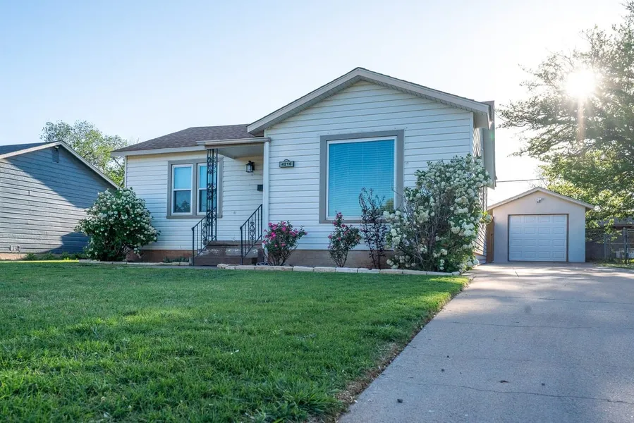 The home includes a 1-car garage and a separate storage building/small shop. The property features newer fencing, a well-maintained lawn, and a spacious backyard suitable for outdoor activities.