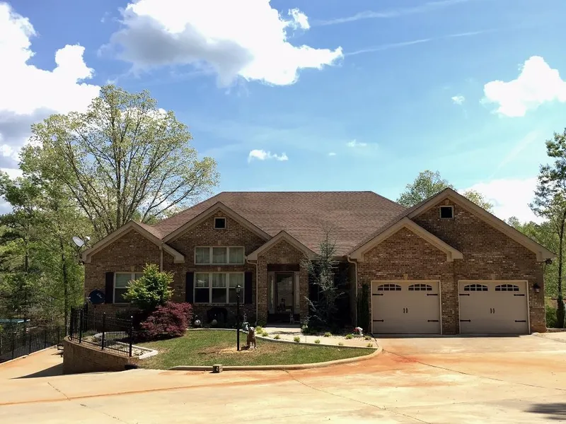 Stunning lake home with gated entry. This beautiful four sided brick home features 111 ft of year around water. The home has 4 bedrooms 3.5 bathrooms and offers many quality upgrades throughout. In the kitchen you will find granite countertops, double convection ovens, a gas range, custom oak cabinetry, large pantry, and eat at bar. A breakfast area overlooks the lake and opens to the spacious living room. Crown molding can be found throughout the entire home. The formal dining room is off the kitchen and features a beautiful coffered ceiling. In the master suite, youll find a tray ceiling and doors that open to the screened in back deck that runs the entire length of the home and overlooks the lake. The master bath has a double vanity, oak cabinets, granite countertops, walk in closets, and a huge walk-in tiled shower. On the main level, there are two more bedrooms featuring tray ceilings, a full bath and a half bath for guests. Downstairs on the terrace level, you will find a kitchenette with an oversized bar, living space that opens to the patio overlooking the lake, another large bedroom, and a full bath. Outside the home a you will find a beautifully landscaped yard and concrete stairs leading to the shoreline where there is an aluminum floating dock with a boat slip. The home has a 2 car garage on the main level and one on the terrace level that would be perfect boat storage.