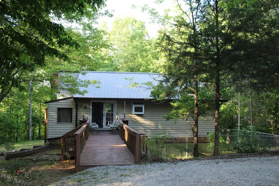Upstairs, the main floor offers an open floor plan with a large living room housing a massive stone fireplace, hardwood laminate floors, and tongue and groove cathedral ceilings. The kitchen opens into the living room and features a dining area, custom cabinets, ceramic tile floors, and all the appliances remaining. There is also a bonus room on this floor that could serve as a separate dining area, office, or sunroom. The master bedroom is also on the main level and has the same floors, wood paneling walls, and cathedral ceilings as the living room. The laundry area is also in the master bedroom, with washer and dryer to remain.
