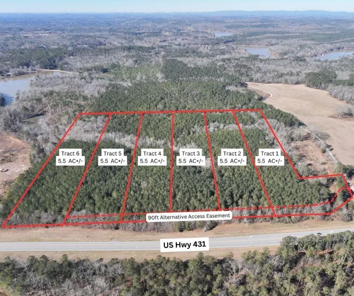This beautiful 33+/- acres property has been divided into six tracts each approximate 5.5 acres in size. Each 5.5 +/- acre tract has approximately 230ft of highway frontage on US 431. This section of Highway 431 has a traffic count of over 5000 per day. Located north of Wedowee, Alabama, the property is not in the city limits of Wedowee but is in the police jurisdiction. This property has no zoning and there no deed restrictions or covenants. It could be used a residential or Commercial use limited only by the buyers imagination. Only minutes from Lake Wedowee, The Town of Wedowee, 90 miles from Downtown Atlanta and Birmingham. Alabama DOT may possibly allow each tract a driveway. Alabama Dot requirements would depend upon the buyers intended use. As an alternative to negotiating with DOT we have allowed for an alternative access coming from the north end of the property. Please see our terms for more info on access.