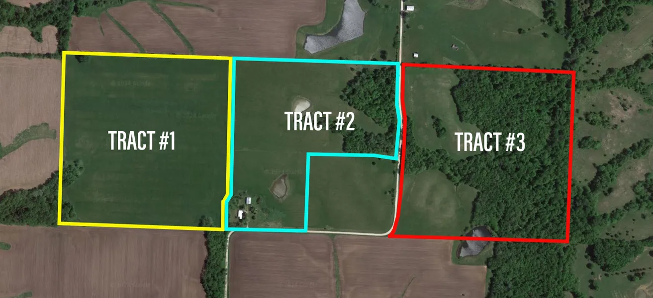 TRACT 2: 30.32 Acres of level to gently rolling farmland - Farm has been in pasture for years and it also would row crop well - Farm is majority open with 1 pond and does have a double cattle waterer w/ corral area Older 32x48ft livestock/machine shed - Currently has 1984 3 bedroom single wide mobile home 14x66ft w/ a 12x48 addition on the west side - Newly updated bath just last fall With some TLC this property could make someone a nice home.