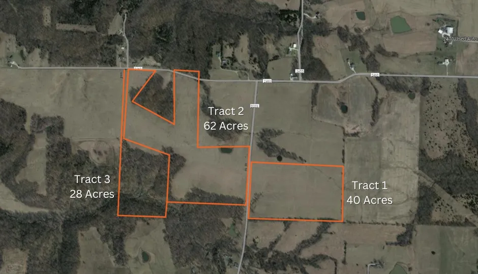 Tract 2: 62 acres showing 51 acres tillable, with 70% made of class 2, Calwoods Silt Loam. This tract offers excellent build sites with utilities available, great hilltop access points, and beautiful views. Tillable acres are currently rented for $200/acre.