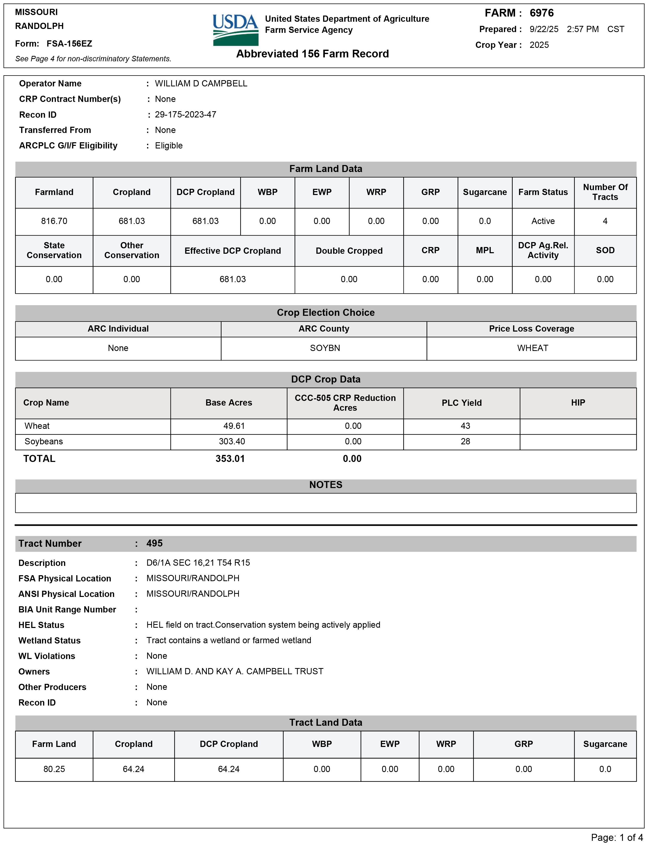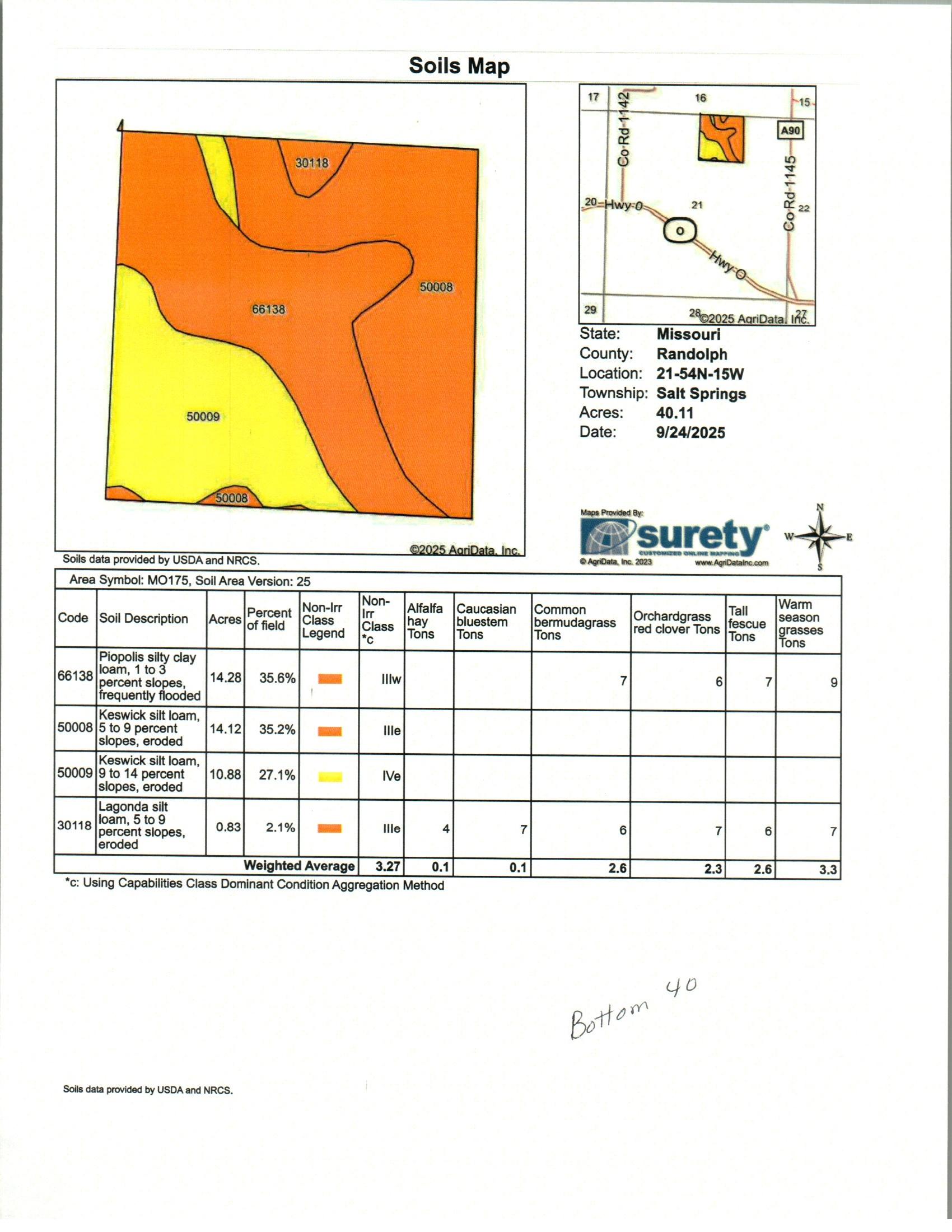 The Davenport Farm consists of basically two 40-acre tracts that touch in the very corner. The north 40 is accessed off the very end of RCR # 1142. The farm is primarily open and currently being used for crop production. The balance is in wooded draws and waterways. There is rural water on the property and electricity is nearby. There are no structural improvements on the property. According to the Randolph County FSA Office there are 60.65 tillable acres currently in crop production.