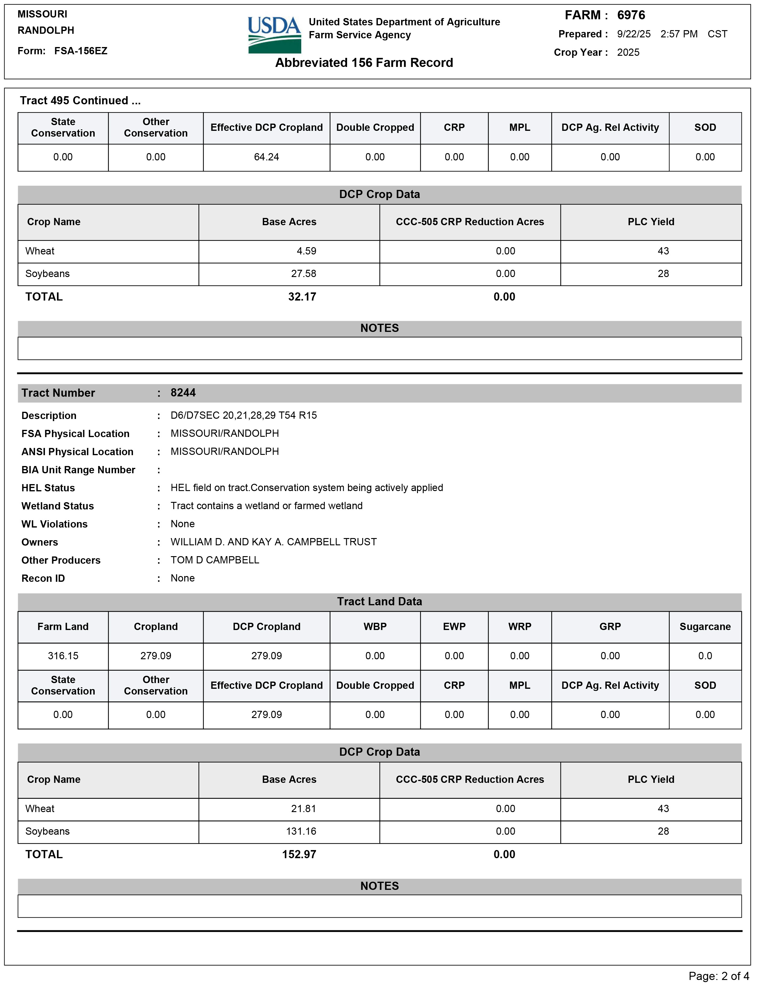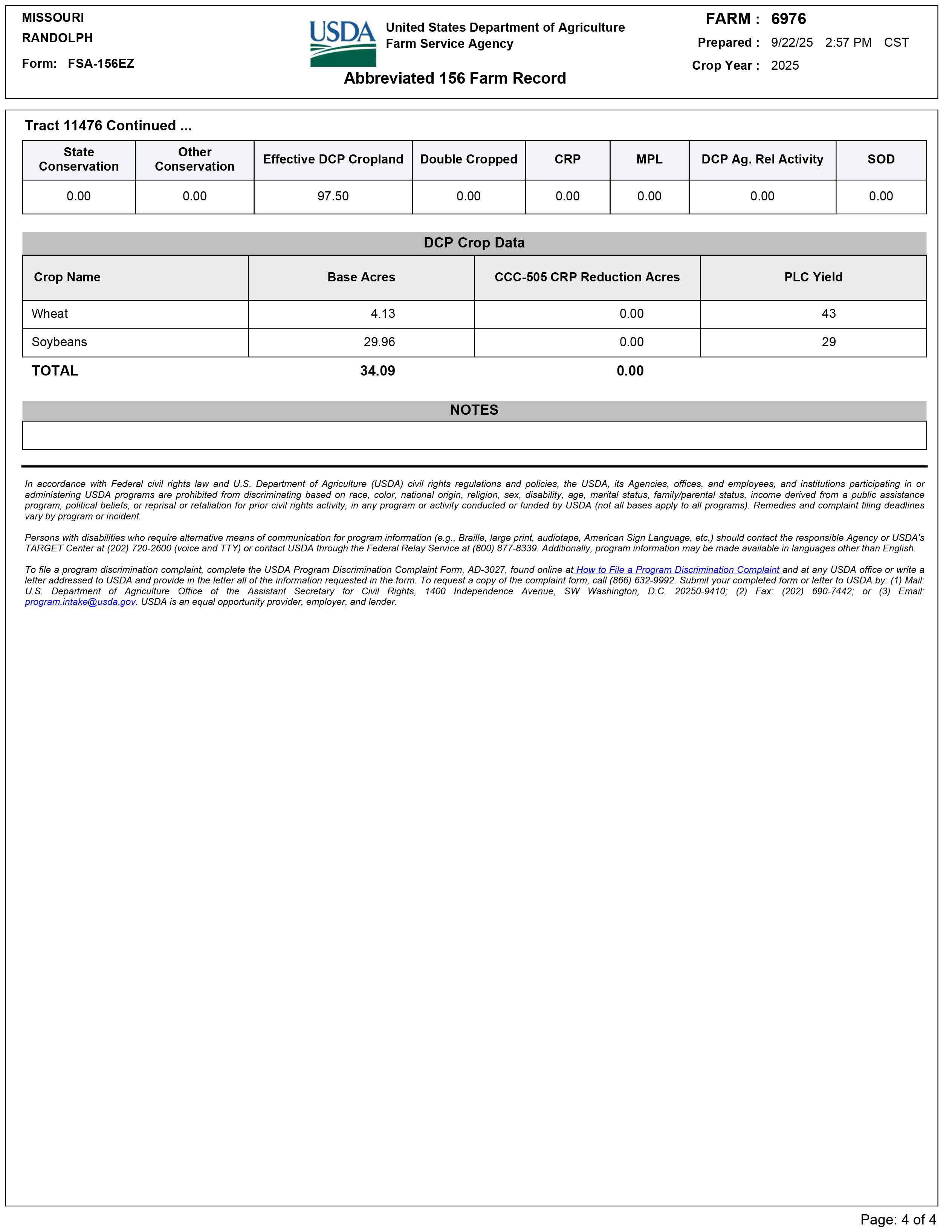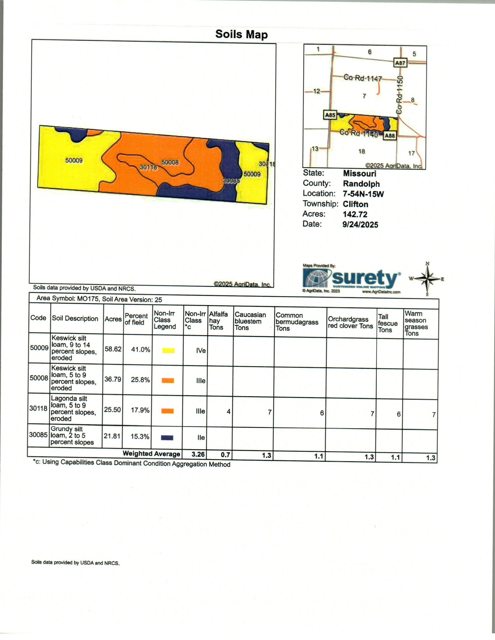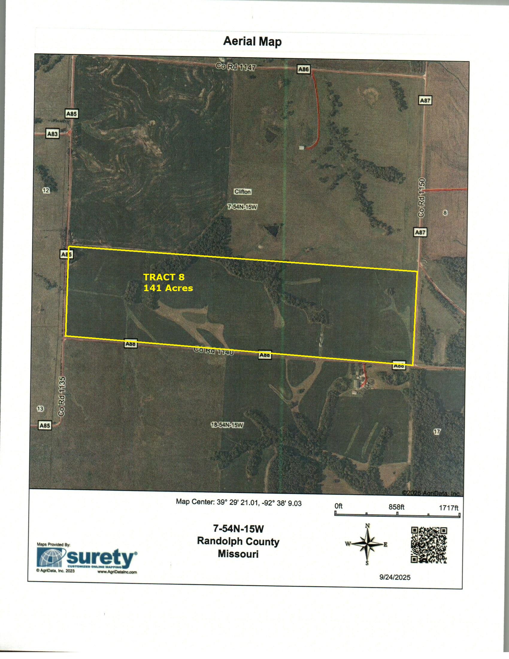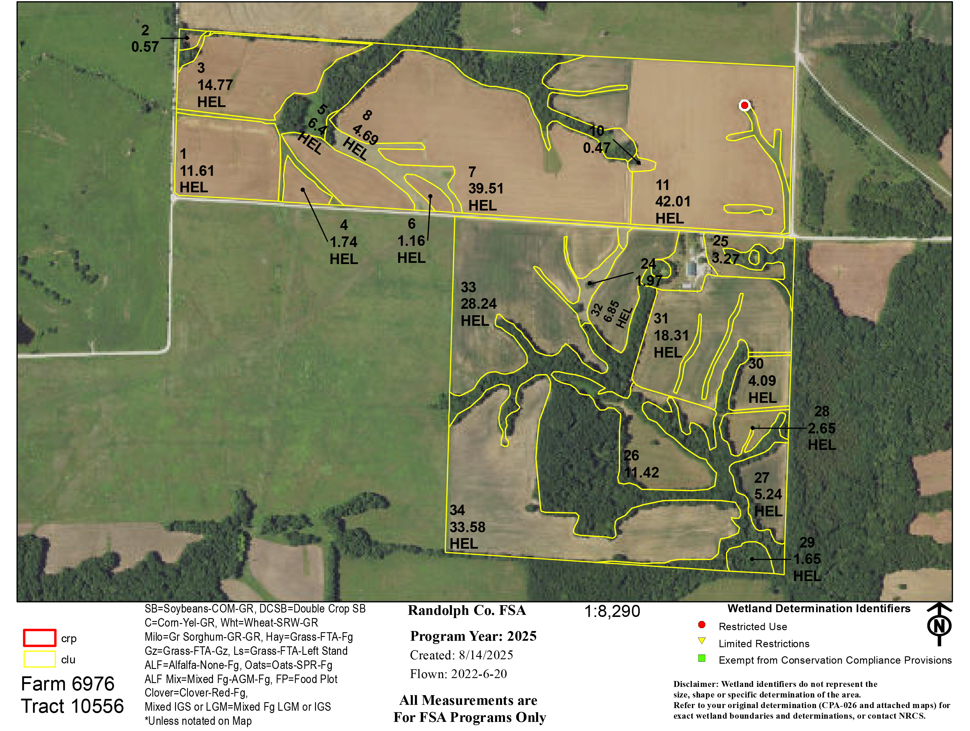 TRACT 8: The Duncan Farm consists of 141 acres that lies in the northwest corner of RCR #1150 on the east side and RCR # 1140 on the south side. With RCR# 1135 on the west side with direct access off all three. It has rural water and electricity is available. There is no structural improvement on this tract. The tract is primarily open and currently being used for crop production with the balance in wooded draws, fence rows and grass waterways. There are several utility easements across this property. The Randolph County FSA Office there are currently 113.6 tillable acres on this tract.