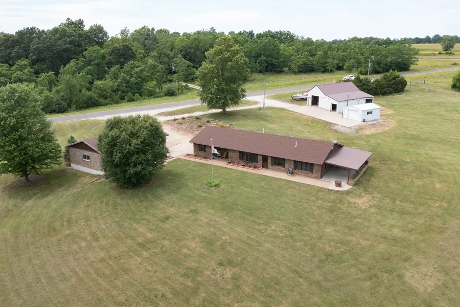 Custom Built Maintenance Free Brick 2 BR, 2 BA Home on 3 Secluded Acres on Blacktop Minutes from Long Branch or Thomas Hill Lake!! Quality Constructed Home with Open Floor Plan Fiber for Internet -New Thermo Seal Windows & Doors in 2016 Spacious Primary BR & BA Skylights in Kitchen/Dining Room Oversized 2 Car Attached Garage Covered Concrete Patio Overlooking Fields Detached Finished 28' x 38' Brick Building Great for Family Gatherings, Game Room, Mother In Law Quarters, Etc. Plenty of Storage for Boats, Trucks & Shop Area 33' x 40' Outbuilding with Concrete Floor & Outside Pad 12' x 40' Lean To Additional 16' x 20' Outbuilding - Call Today!