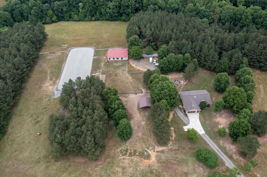 A horse enthusiasts paradise! This traditional brick home is tucked away on a private setting, surrounded by almost 29 acres of land with trees bordering the parameter of the property and a small creek running through it. The home has numerous updates with an open floor plan that provides for easy living, making it a must see! The basement has been finished into a fantastic entertaining and second living space with a guest room, exercise room, game room, and media room. Boasting an amazing wet bar and serving area that adds a fun and lively touch of character to the room. Additional unfinished storage areas in the basement provide convenient access. Love the outdoors? Then you will love the large firepit area that overlooks the fenced horse pastures. Impressive metal horse barn with 7 stalls and equipped with tack room, wash rack, feed room, and fly spray system. Wonderful dressage riding arena (200 x 90) with professional footing and LED lighting. RV pad with 30-amp hookup is perfect for parking/storing your recreational vehicle. If you are looking for a private estate to enjoy the outdoors, this property is set up and ready to go! Dont miss this great opportunity!