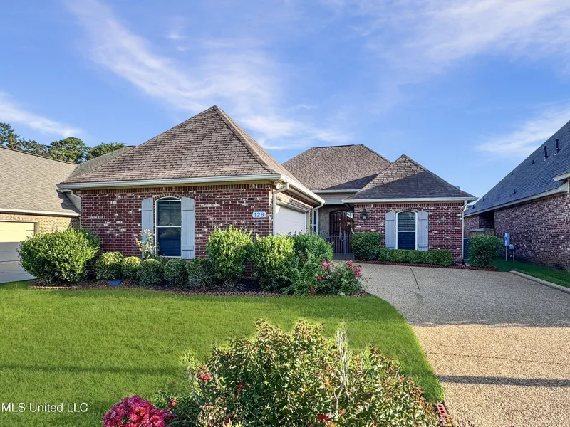 Tucked into one of Asbury's most charming streets, this French Acadian-style home offers timeless curb appeal and a thoughtfully designed interior. The home features a private gated courtyard and an iron double front door that opens into a welcoming foyer. Situated across from one of the neighborhood ponds, you'll enjoy peaceful views of the water and fountain right from your front courtyard. Inside, the layout offers a spacious and open feel with hardwood floors running throughout the main living areas and all three bedrooms. The living room features a cozy gas fireplace and flows seamlessly into a formal dining room at the front of the home and a separate breakfast nook off the kitchen. The kitchen is well-equipped with excellent counterspace, abundant cabinetry, and a functional layout perfect for daily living and entertaining. The large primary suite is privately located and includes a spacious bathroom with double vanities, a corner jetted tub, separate shower, and a walk-in closet. On the front hallway of the home, two guest bedrooms share a full hall bathroom that includes a walk-in tub, offering accessible comfort for those in need of this added convenience. A dedicated office with built-ins provides a quiet space for work or organization, and the laundry room includes a sink and great storage. Out back, the oversized covered patio overlooks a fully fenced yard, ideal for relaxing or entertaining guests. Additional features include vinyl trim for low maintenance, gutters, upgraded security doors at the garage and patio entries, and security screens on all windows. The HVAC system has been updated to a high-efficiency unit to help with energy savings. Asbury is a quiet, well-maintained community that features a neighborhood pool, clubhouse, and several scenic ponds. Its location offers quick and convenient access to medical facilities, shopping, dining, and entertainment, as well as easy connectivity to Pearl, Flowood, and Brandon.
