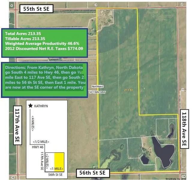 Research Parcel InformationDirections; From Kathryn, North Dakota go South 4 miles to Hwy 46, then go mile East to 117 Ave SE, then go South 2 miles to 56 th St SE, then East 1 mile. You are now at the SE corner of the property