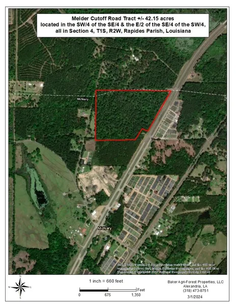 This impressive 42.15 acres tract within the village limits of McNary, LA presents a rare opportunity for investors, developers and timberland buyers alike. Ideally situated on the west side of HWY 165 and south of Melder Cutoff Road, the property boasts approximately 700 feet of frontage on Melder Cuoff Road and 1,000 feet on HWY 165 South, ensuring excellent accessiblity and visibility This would make a good commercial site. The land is predominatly covered with old growth pine sawtimber, complemented by a lesser amount of hardwood sawtimber and pine/hardwood pulpwood - providing immediate and long -term value. A timber inventory was conducted in Septmber 2023 by Baker Land & Timber Management, Inc., a forestry consulting firm confirming the property's rich natural assets. Estimated timber volumes by product class can be found in the property information sheet.