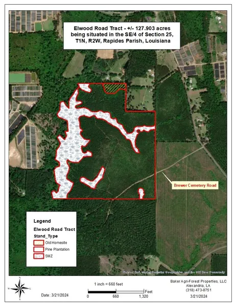 The second access route is to head south on Elwood Road from the interesection with Blue Lake Road a distance of about 6/10ths of a mile and turn right on Brewer Cemetery Road, a Rapides Parish public road that has been confirmed with the Rapides Parish Police Jury by this firm. Proceed on this public road just over 1/4 mile to hit the east line of the sugject tract. The road continues through the subject tract and exits the property on the south line, before arriving at Brewer Cemetery. Please refer to maps for details.