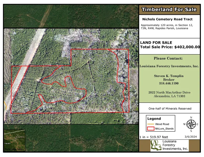 Research Parcel InformationLocation and Access: This tract is located approximately three miles west of Gardner. Turn south from LA 28 onto Nichols Cemetery Road. Historical access has utilized the woods road going though a blue gate from Nichols Cemetery Road to the southern portion of the property. The gate and access is on and through Arbor, LLC. Please call Steven K. Templin at 318.446.1190 before inspecting the property to get permission to go through the locked gate.