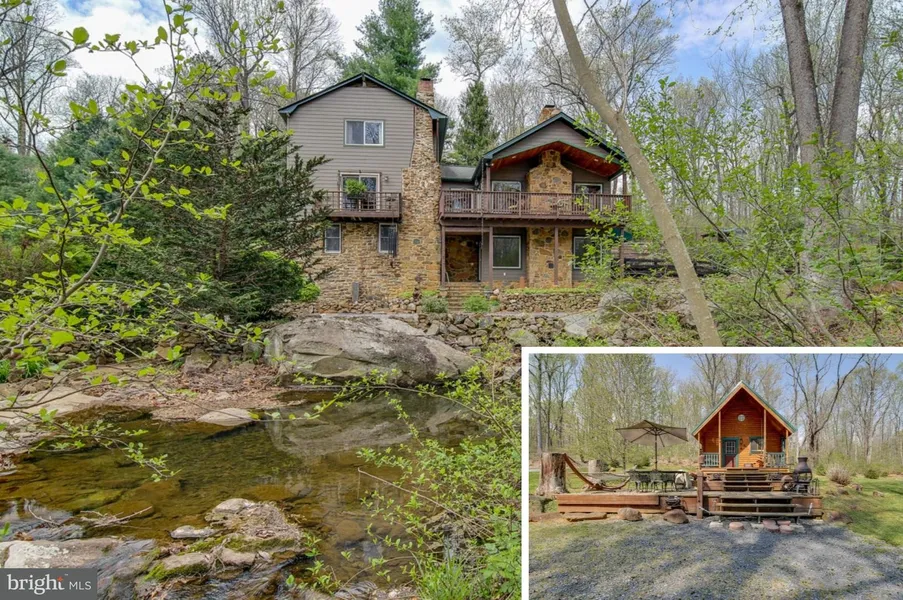 Instant equity! 4 bdrm/3.5 bath main house AND charming 2 bdrm/1 bath guest cabin (deeded sep.) for a total of 11 enchanting acres. Fabulous features t/o with post & beam construction, reclaimed floors. Full time residence or refreshing retreat. Cabin has been profitable rental. Extensive hardscape, fenced/tiered organic garden, sep. workshop/studio, generator. Hittles Run flows through property.