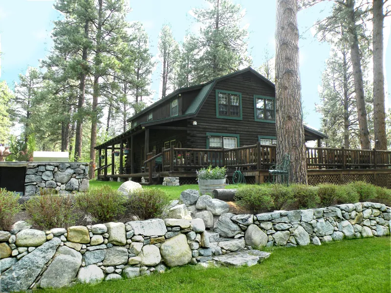Charming log home with warm attractive interior, wood flooring, slate tile, beadboard accents, pretty doors and windows. Lots of light! Huge wrap around decks for enjoying the green lawn and tall pines. Trout pond. Many upgrades including a deluxe guest cabin with rich interior. Antiques & western furnishings may be purchased at a dramatic discount. Close to trailhead and Forest Service boundary.