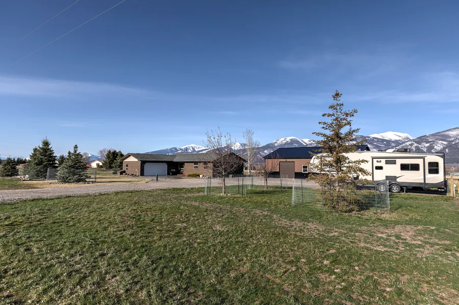 RV parking with 50 amp electrical service large shop with 12-foot doors and 100 amp service. The home's entrance walkway and front porch are stamped concreteThe property is landscaped with an underground sprinkler system and fruit trees, providing a picturesque setting for out...