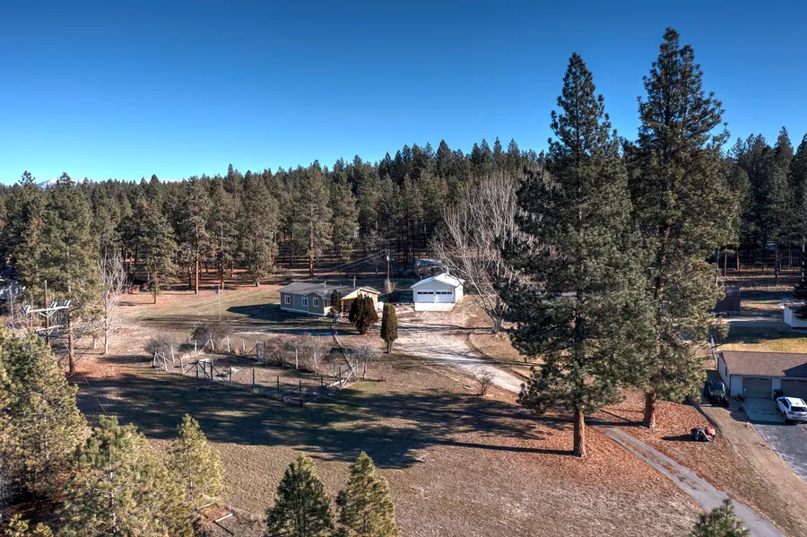 Great location for 2018 home on 2.39 acres east of Florence.. The 1238 square feet with lots of natural light boasts 1.75 bathrooms and 3 bedrooms. There is a front porch that is great for welcoming your guests or just sitting and enjoying the outdoors. A detached garage with/shop, a garden shed with electricity and a older sheep barn are also on the property. . There are ponderosa pines and the location close to the eastside Hwy for ease of commuting. MDOT purchased land from properties along this area of east side to construct turn lanes ETC. The orange flags mark the new boundaries. The modular built by the University of Montana and settled on a permanent foundation faces the spectacular Bitterroot Mountains.