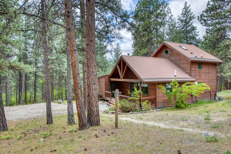 Charming and private...this cabin style home sits on 5.01 wooded acres on the westside of the Bitterroot. Big covered front porch, inviting wood stove for year round warmth, lovely cabinetry and wood accents. Main level features open vaulted living room, kitchen, bedroom with tongue and groove ceiling, walk-in closet, full bath, utility area and unfinished family room. Upper level includes large bedroom, walk-in tile bath, walk in closet and a skylight to provide more natural light. Like new detached 2-car garage with enclosed storage room and a large attached carport. Central air conditioning for cool comfortable summer days and a generator if you need one!. Additional finished separate shop/studio building with heat and windows, perfect for any hobby or additional storage/living area. Natural landscape surrounds this quiet country home. Healthy pines, private and ready for immediate oc...