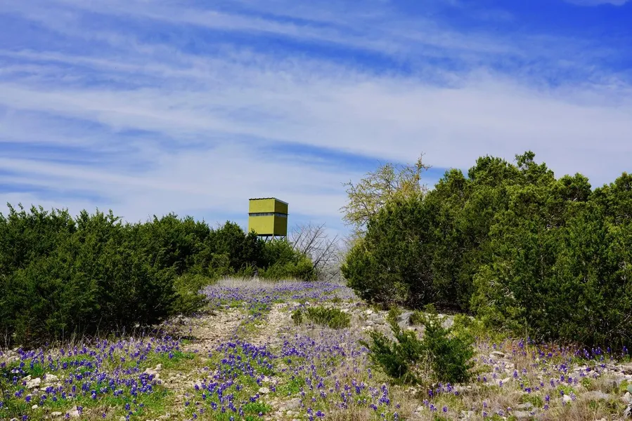 HIGHLIGHTS : Camp Area with Covered Pole Barn, Corn Feeders & Bow Blinds, Two Gated Entrances, Interior Ranch Roads, Level Grassy Bottomlands, Elevation Changes and Exposed Limestone, Views, High-Fenced on Three Sides, Two Water Wells, Electric