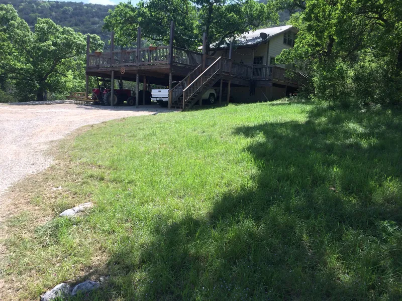 House has kitchen, living area, two baths (one with shower only); one bedroom downstairs; loft bedroom upstairs. Includes dishwasher, washer/dryer, fireplace, and whirlpool tub. Large party deck with hooks for string of lights built around large oak tree with three hammock stations, benches, etc.