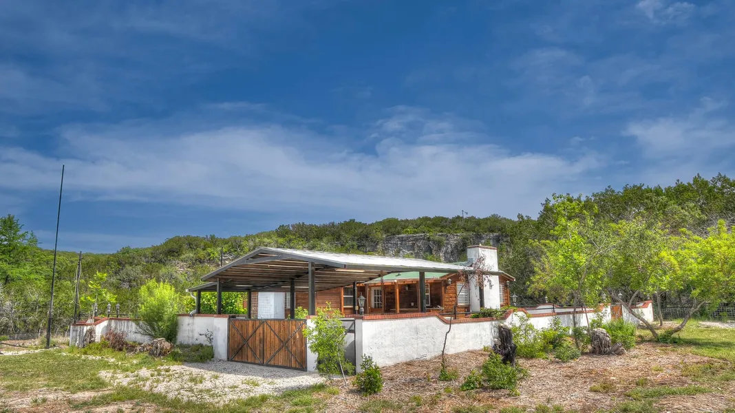Set on 5.23 acres about 10 miles northwest of Leakey in Rancho Real, the property lies in a peaceful canyon along a spring-fed, constant-level lake lined with cypress trees. Extensive cedar clearing and mulching have created a beautifully landscaped and fenced yard.