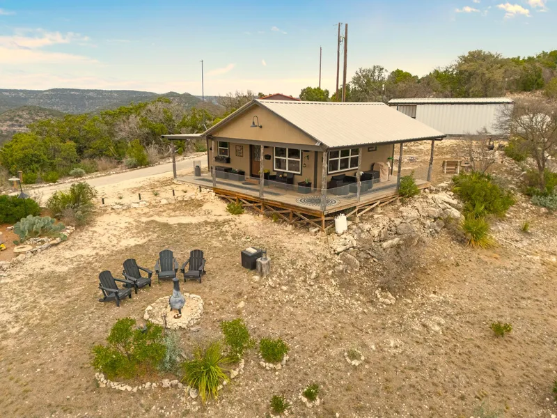 Experience a spectacular retreat in the Texas Hill Country! This immaculate 1-bedroom, 1-bathroom home sits on six acres and is truly one-of-a-kind. Recent upgrades include new flooring, appliances, two mini-split units, and all-new light and plumbing fixtures. It also features an indoor/outdoor whole-home audio system, security system, gutters and much more. The half-wrap deck is ideal for entertaining guests while taking in the stunning views of the surrounding hills. Additional highlights include fiber optic internet, a modern rainwater collection and filtration system, an outdoor seating area with a chimenea, a detached carport with an EV charging station, and extra storage space. Located in the private, gated community of Roaring Springs Ranch, this property offers deeded access to a 53-acre homeowners' park that includes a picnic area, hiking trails, a spring-fed swimming pool, and a 5-acre lake. Being sold fully furnished.