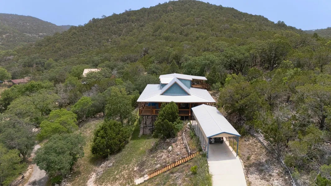 Located in gated Roaring Springs, approximately 12 miles west of Leakey, landowners will have access to a 50+ acre common park area loaded with spring-fed water. Owners will be able to enjoy a trickling creek, picture perfect waterfall cascading down chiseled rock formations, a deep swimming hole and a stocked lake for fishing and paddle boarding! The home has been recently remodeled and the wide, covered, porch wraps around the entire home for lots of outdoor entertaining and relaxing. The home takes in the views with large picture windows in the living/dining area. The kitchen is an efficient galley style with a large utility room off of it. On the main level is the master bedroom and bath with a walk-in closet, equipped with built ins. Nestled into a hillside, this 3BR/2B/loft home has incredible views of a scenic, spring-fed lake. The second floor offers two bedrooms, bathroom and loft area along with a private deck off the back bedroom. There is a cozy guest cabin perfect for those wanting their own space and a fenced area for the pets! Home will come mostly furnished and includes water gear to enjoy at the lake. All this is situated on 7.22 acres and it extends up and over the hill and to another road, making the land accessible from both sides of the hill. This property should push all the buttons for those looking for a family retreat or someone wanting a quiet lake life! $499,000.