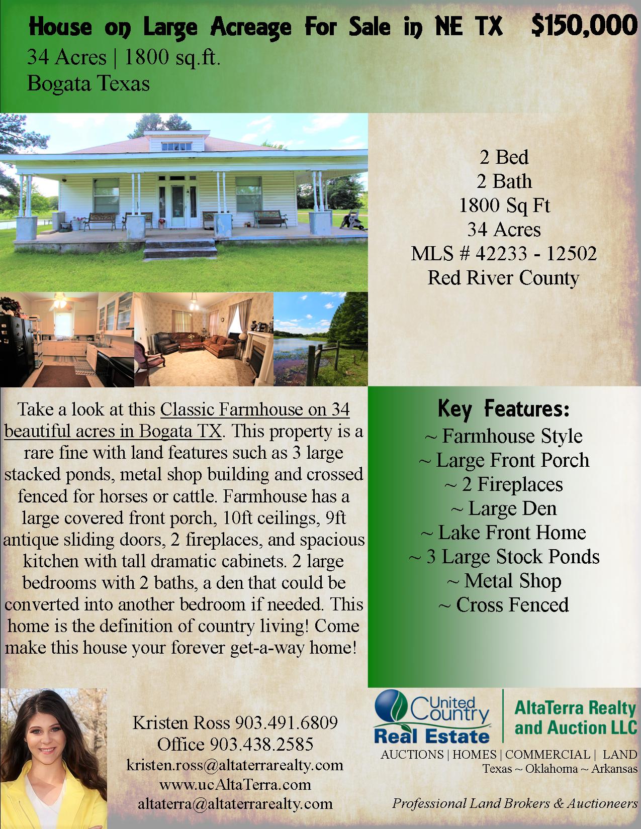 Take a look at this Classic Farmhouse on 34 beautiful acres in Bogata TX. This property is a rare fine with land features such as 3 large stacked ponds, metal shop building and crossed fenced for horses or cattle. Farmhouse has a large covered front porch, 10ft ceilings, 9ft antique sliding doors, 2 fireplaces, and spacious kitchen with tall dramatic cabinets. 2 large bedrooms with 2 baths, a den that could be converted into another bedroom if needed. This home is the definition of country living! Come make this house your forever get-a-way home!
