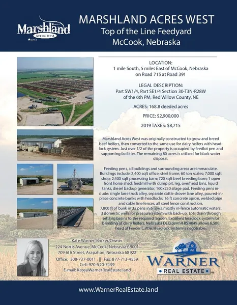 Top of the line feedlot on 168.6 acres. Constructed to grow beef heifers & converted for dairy heifers w/ a headlock system. Feeding pens, all buildings & surrounding areas are immaculate. Property includes: 2400 sqft office, steel frame, 60 ton scales, 7000 sqft processing barn, 720 sqft breeding barn, feed mill w/ dump pit, leg, overhead bins, liquid tank, diesel backup generator, silage pad. 7,800 ft of poured-in-place concrete bunks, welded & pipe fences, all steel construction, auto waterers, 3 wells.