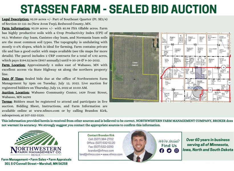 Date & Time: Sealed bids due at the office of Northwestern Farm Management by 5pm on Tuesday, July 12, 2022. Live auction for registered bidders on Thursday, July 14, 2022 at 10:00 AM.